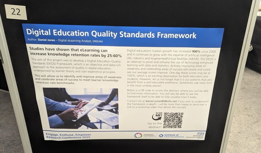 Our Digital eLearning Analyst, Daniel Jones, submitted a poster for the EEE conference to show the Digital Education Quality Standards Framework he has produced that allows us to better understand where we need to improve to meet our learners needs.